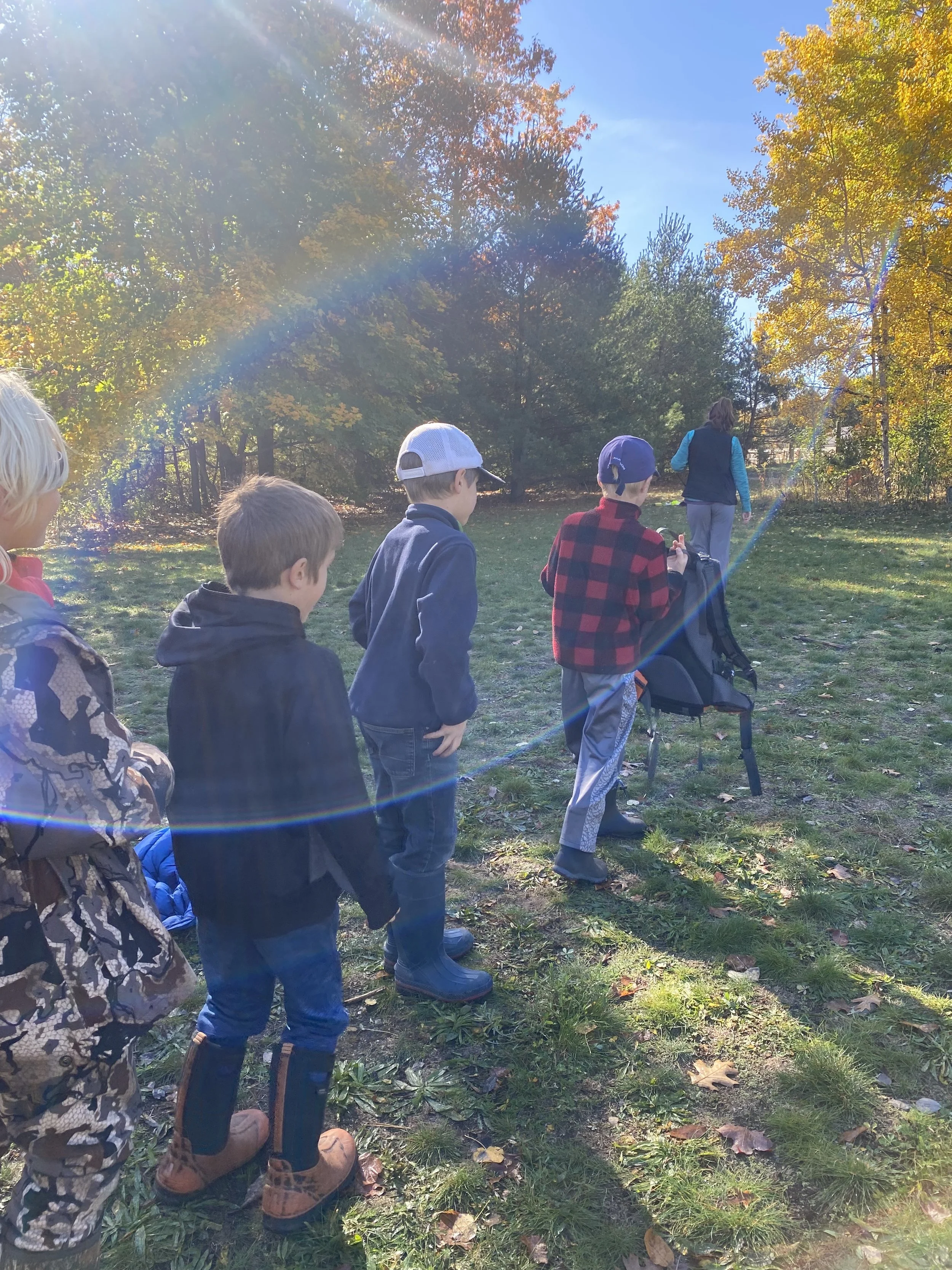 We took advantage of the gorgeous fall day today! Ms. Paige and Ms. Rachel planned a long hike on a new-to-some-of-us trail to look for evidence of beavers after last week’s discussions. Before we left the pavilion, we competed in a relay race to pack for a day hike. We first brainstormed what items are useful when outdoors for long lengths of time. We first wanted to bring things like waders or toys from home for fun along the way, but after thinking about how easily backpacks get weighed down, we decided on more practical items like snacks, water, and maps.