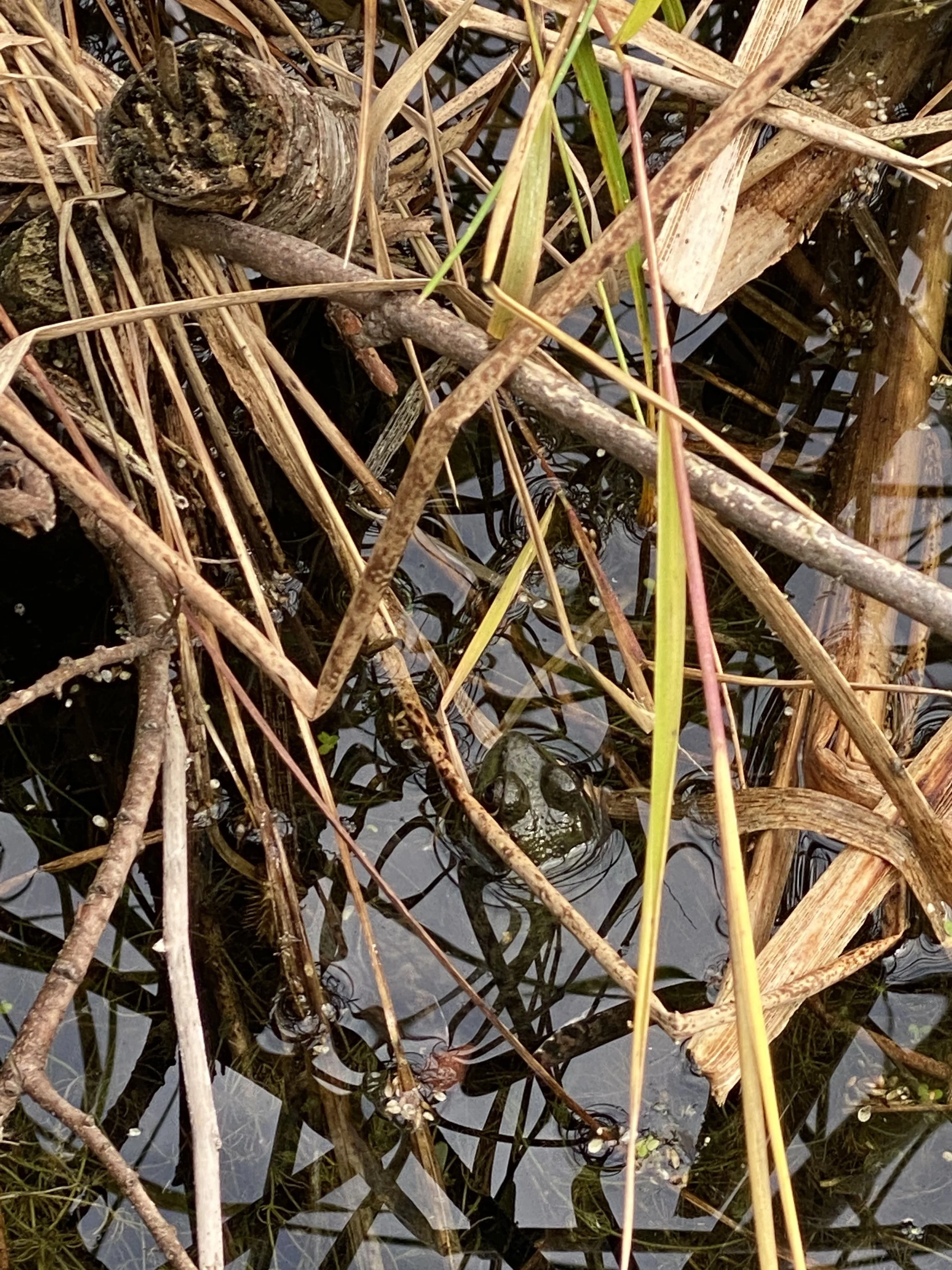 Today was all about frogs! Ms. Paige showed us a bullfrog specimen in the Nature Center so we could get a closer look. We noticed circles behind their ears–these are their tympanums, which allow them to detect sounds. We also got to see the different life cycle stages of frogs–from egg to tadpole to adult. We talked about how the frog babies have to go through a big change (metamorphosis!) to become adults. We also listened to a story about things that are hurting frogs in nature–habitat loss, pesticides, etc. Then, we set off on a hike to find a frog or two on the Natural Education Reserve. We made sure to play on the rocks and explore the trees along the way. At the frog boardwalk, we found two frogs and one turtle and decided they probably will not be out much longer because the weather is turning cold. What a lucky day!